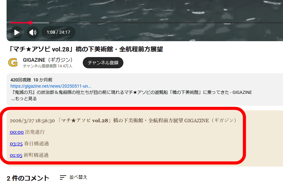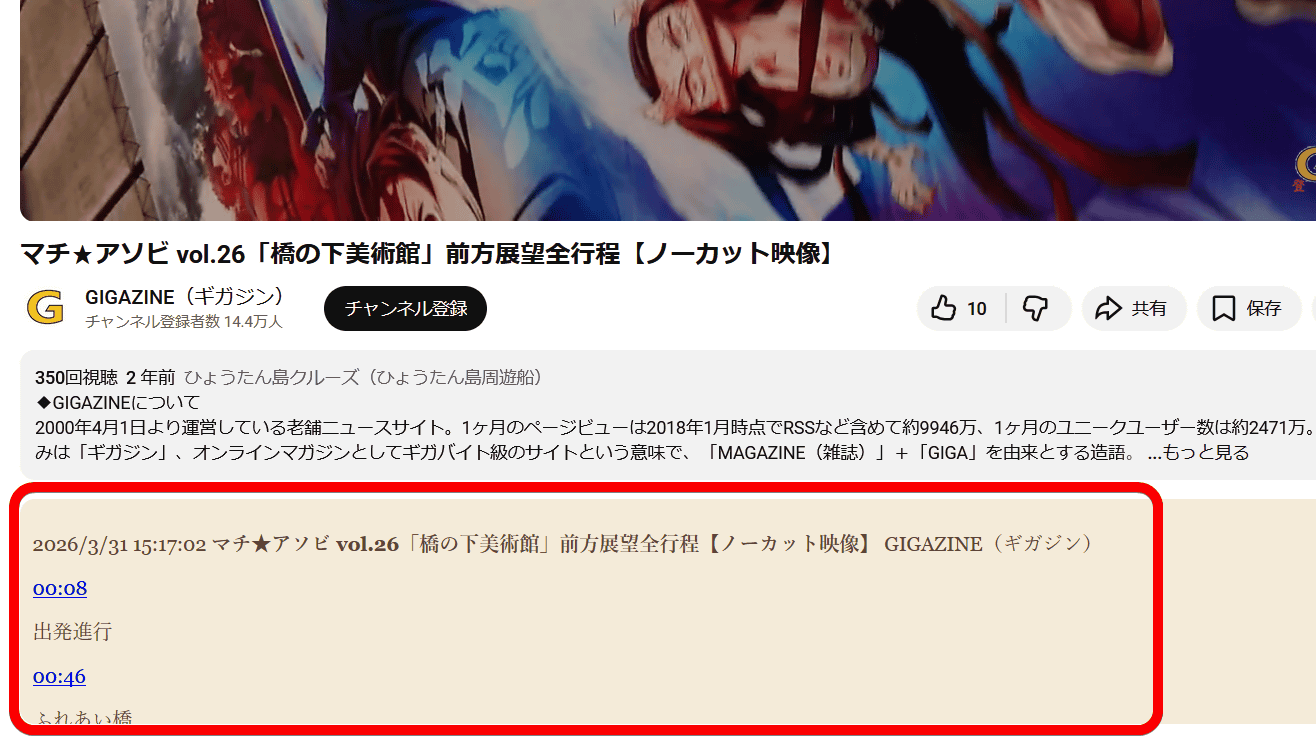 記録したタイムスタンプは、動画タイトルと概要欄の下に表示されます。もちろん再生時間をクリックすると、ムービーが該当する場面にジャンプします。ただし、タイムスタンプのメモは「入力した順番」に追加され、再生時間順に整理されるわけではないので注意が必要です。