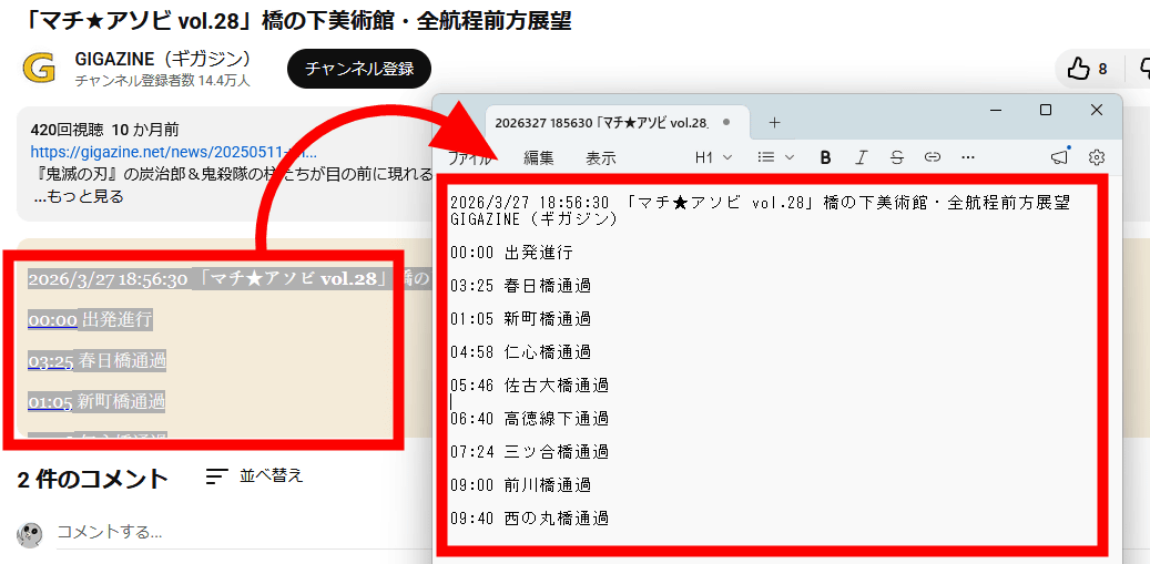 タイムスタンプのメモはそのまま選択して、手元のメモ帳に残すことが可能。コピー&ペーストしたタイムスタンプはコメント欄で共有することもできます。