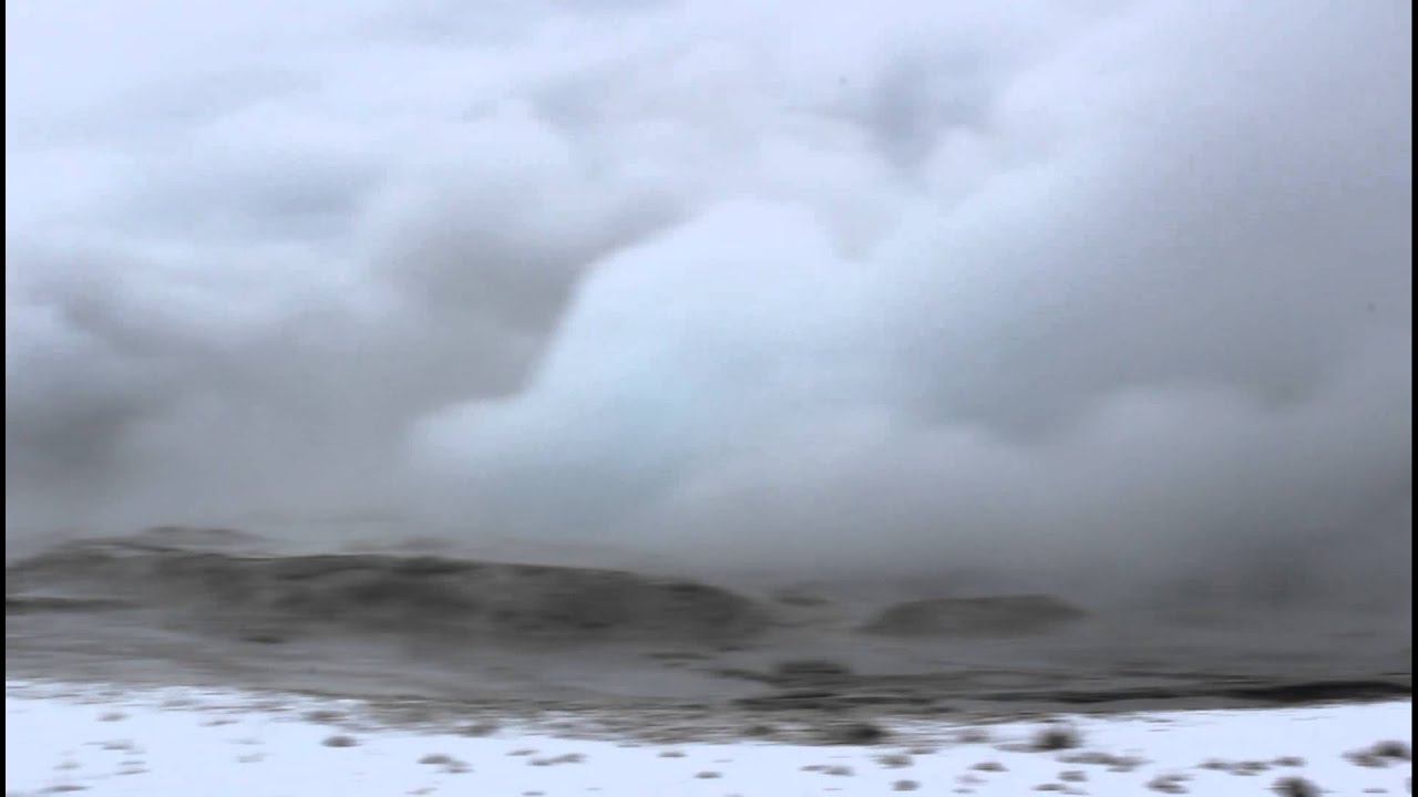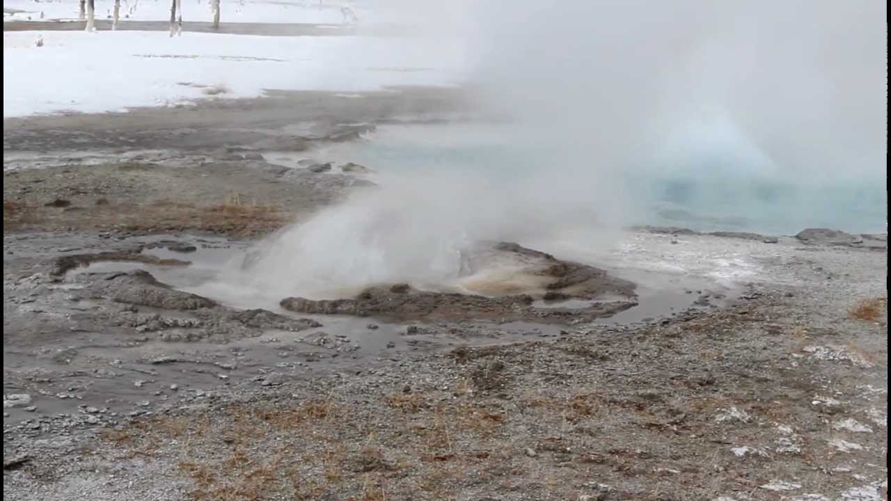 白銀世界に間欠泉が噴き上がるアメリカのイエローストーン国立公園
