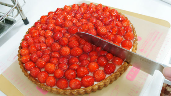 芸術的にイチゴが敷きつめられているタルトですが、食べるためにはやむを得ないのでカットします。