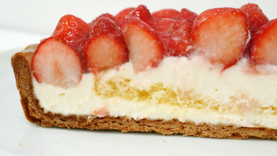 イチゴの断面の赤と白のコントラストがきれいです。このタルトは、サワークリームを加えたカスタードと合わせてあります。断面を見ると、カスタードの間にスポンジ生地が挟まれているのがわかりました。