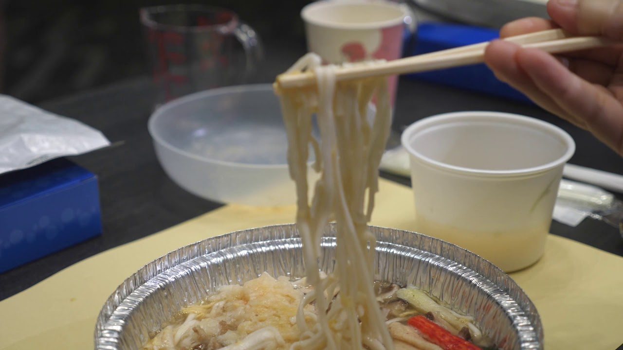 「フリーズドライの匠 一人鍋 海老天ぷら入り鍋焼うどん」の麺がフリーズドライと思えないほどしっかりしてました - YouTube