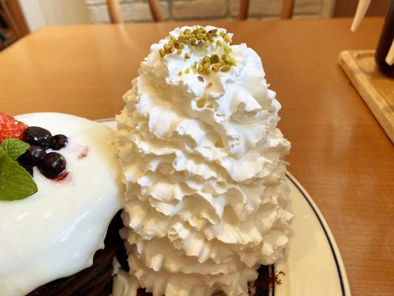 パンケーキの右側には、エッグスンシングスおなじみのホイップクリームが山盛りに。細かく刻まれたピスタチオがトッピングされています。