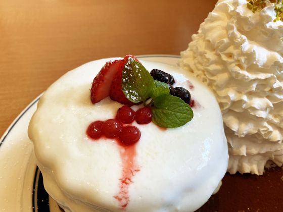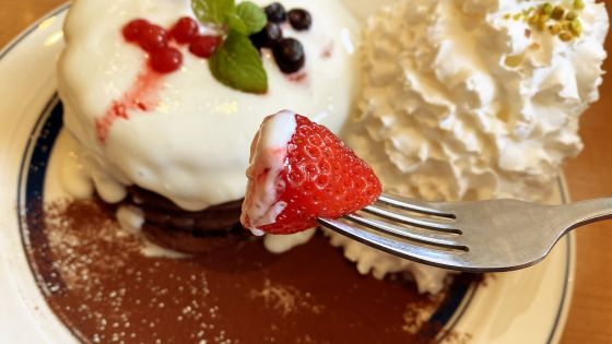 食べてみると、ホイップクリームの軽やかさとミルククリームの濃厚な甘さがお互いを引き立てていて心地の良い味わい。「ちょっと食感があっさりしすぎかな?」と思ったところにまったりとしたカスタードクリームとシャキシャキのイチゴがいいアクセントになり、パンケーキのボリュームを感じさせない飽きのこない一品でした。