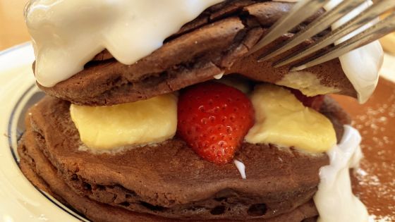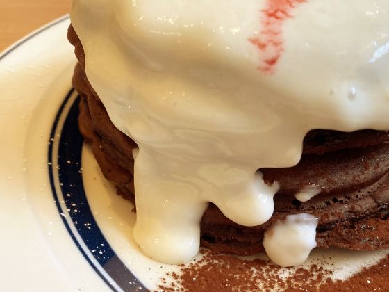 ミルククリームがとろとろとパンケーキから流れ落ちる様子は、食欲をそそる光景。