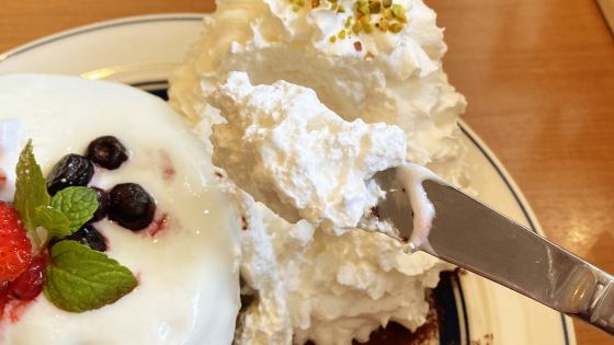 いよいよパンケーキ、イチゴ、ホイップクリームを同時に食べてみます。ホイップクリームをナイフですくって......