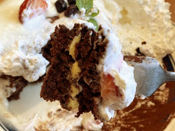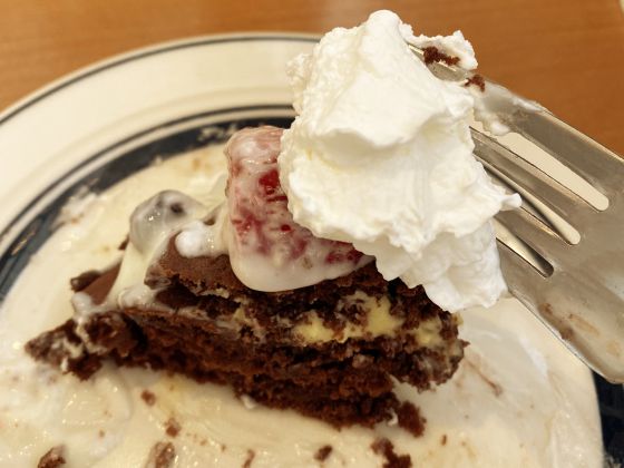 ショコラパンケーキはミルククリームが浸透していてもろく崩れやすいので、ナイフで大きめにカットして小皿に移して食べると食べやすかったです。