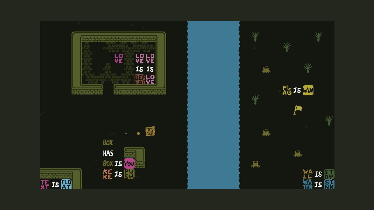 とにかく試行錯誤でテキストを組み合わせてルールを作ることで、ありとあらゆるルールを試してみるのが攻略のコツです。組み合わせによっては思いもよらないルールが誕生して驚かされることもしばしば。以下のムービーでは「WATER IS SINK」というルールでプレイしていますが、「BOX HAS BOX」とテキストを組み合わせてみたら「BOXが消滅するとBOXが生まれる」という無限ループのようなルールが生まれてしまいました。