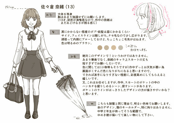 原作ネーム担当による設定画。ふわりとウェーブがかかった髪型がチャームポイント。