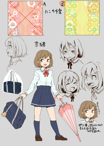 作画担当による着彩デザイン。全体的に丸っこくより子どもらしいデザインに仕上がりました。画像上は、ナオのお気に入りのハンカチ。