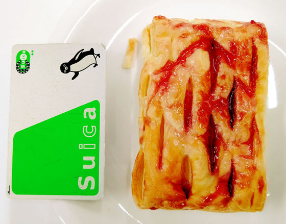 まずは「ラズベリーチーズパイ」から食べてみます。大きさを交通系ICカードと比べてみるとこんな感じ。