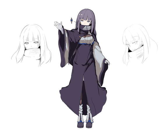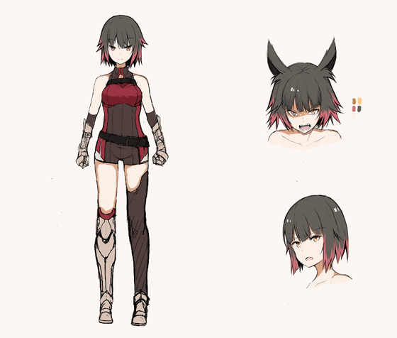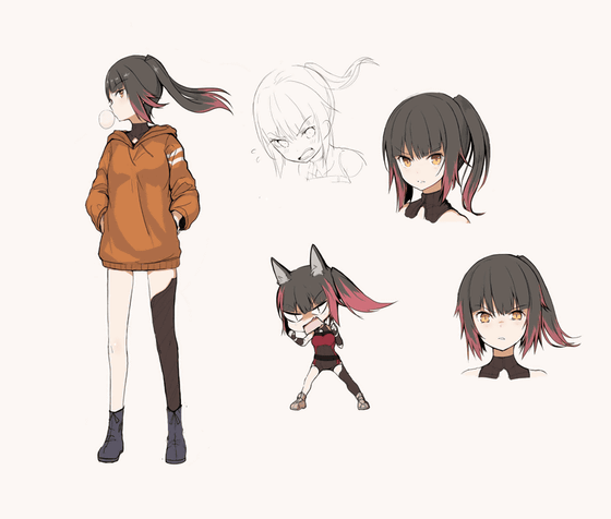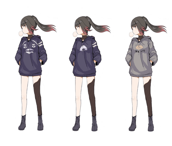 初案を受けて希望や修正を反映した第2案。クズールより年下の後輩っぽいキャラということで年齢感を少しだけ下げ、髪型も初期案をできるだけ生かしつつかわいらしさも出るサイドテールを追加。パーカーは1話でクズールが着ているデザインのもので、クズールから強奪しているという設定。パーカールックは今後どこかで登場するかもしれません。