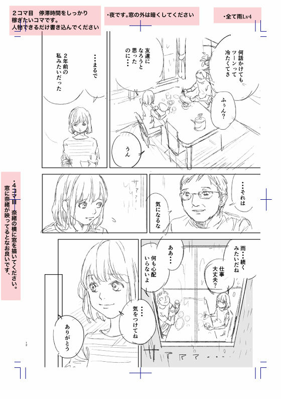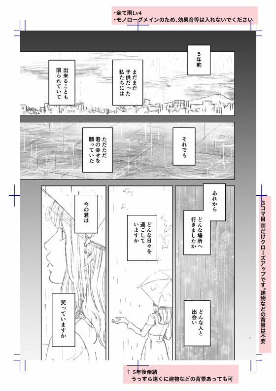 1話1ページのネーム。雨の強さや演出面など絵だけでは読み取りにくいところは、余白にメモ書きを残して作画担当に伝わるようにしています。