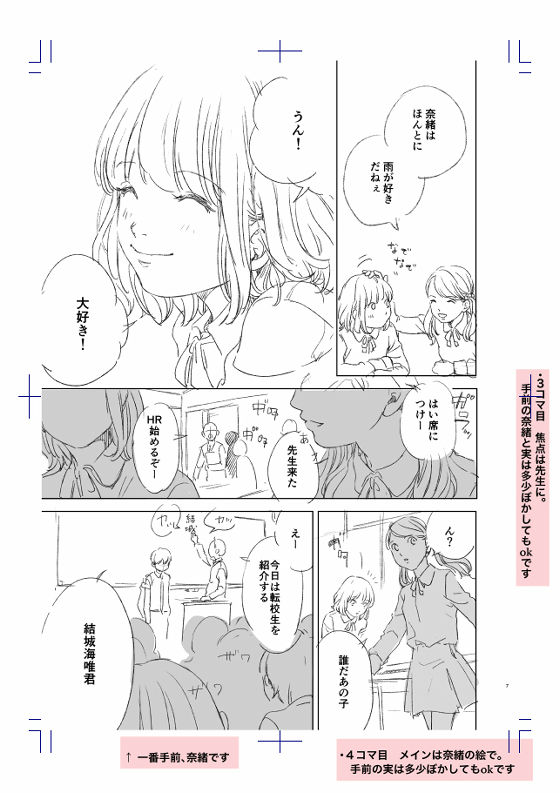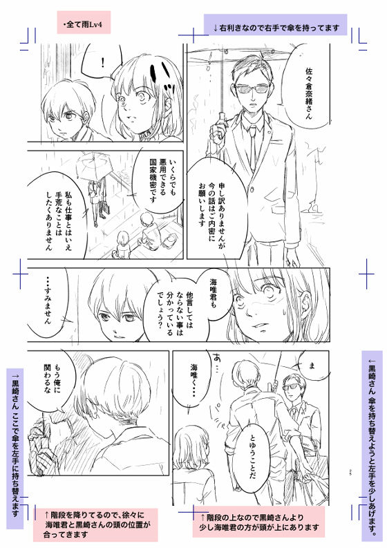 また、「あめあめ」のネームでは「間」の演出にこだわりが所々で見られます。これもネームの絵だけでは「間を表現している」のか「動きを丁寧に描写しているだけ」なのかは分からない場合があるため、細かくメモ書きがしてあります。