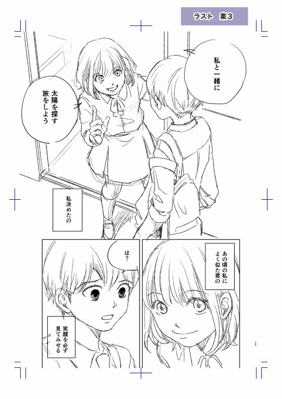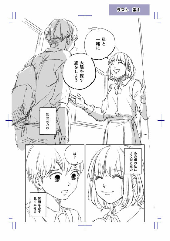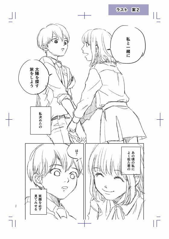 1話ラストの30ページは、「第1話の引きは大事」ということで印象的な構図を複数案検討していました。案1は見上げる構図で、にこやかなナオと戸惑うカイの表情が対比されているカット。