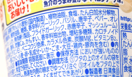 原材料の欄を見ると、かやくの「いか」「魚肉練り製品」といった魚介類の素材や……