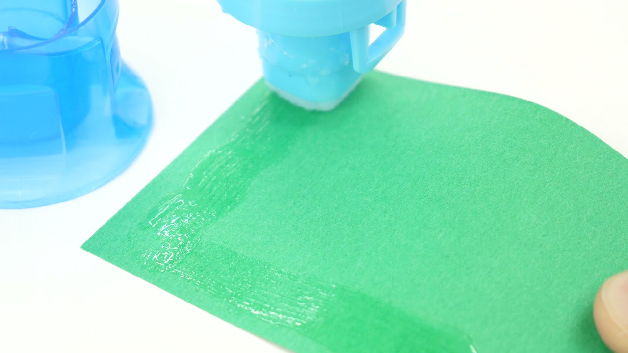 実際に使うとこんな感じ。液体タイプに比べてやや力をかける必要があり、塗りムラも出る印象。塗った直後から爆速で色が消えるので、手早く貼り合わせたほうが良さそうです。