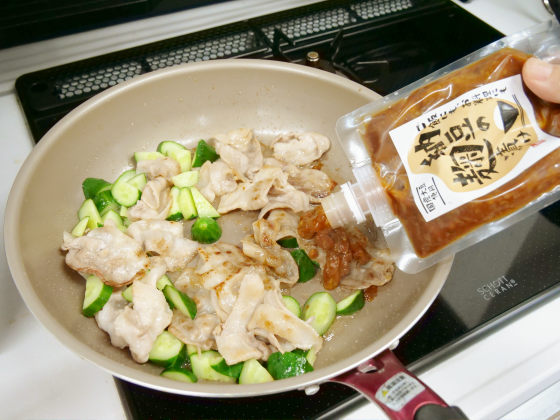 作り方は、豚肉ときゅうりをゴマ油で炒めたところに納豆の麹漬け、酒、砂糖を入れるというもの。