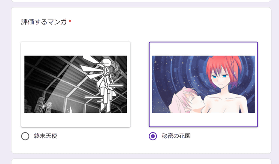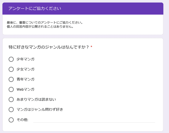 また、フォームの最後で好きなマンガのジャンルについてなどの簡単なアンケートに回答をお願いします。アンケートに回答したら審査フォームの送信は完了。