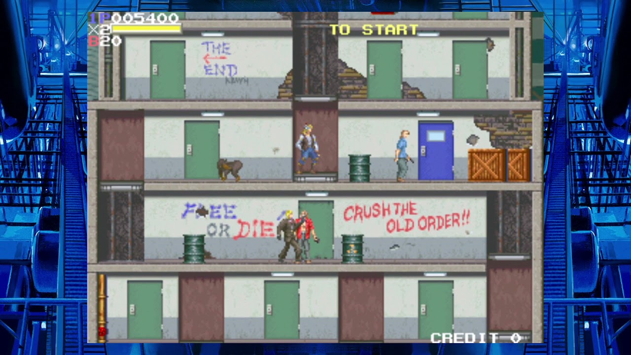 「敵のビルに侵入し、エレベーターで階を降りながらデータを集めて脱出する」という点は、「エレベーターアクション」と全く同じですが、グラフィック表現が格段に向上している上に、操作性もアップしているので、アクションゲームとしては相当な進化を遂げているのがわかります。「エレベーターアクションリターンズ」はアクションゲームとしてかなりやり応えがあり、おすすめです。