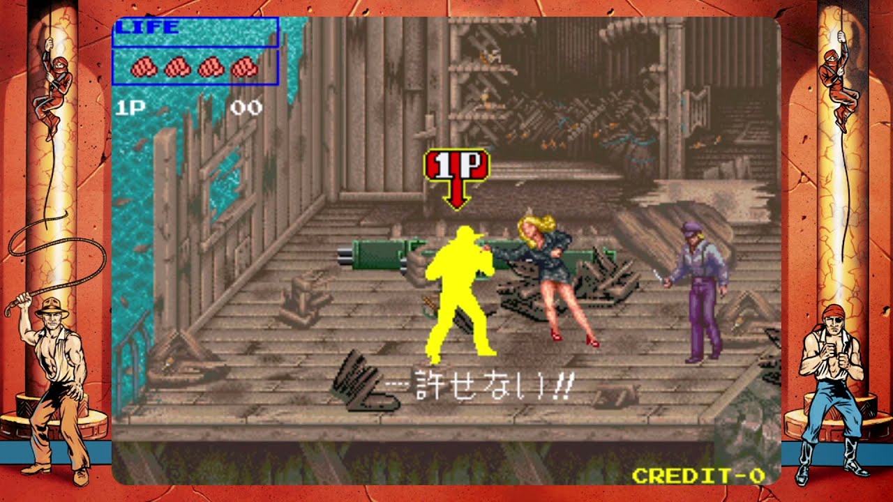 「ルナーク」は、悪の密猟グループ「ベルサー動物保護法人」を取り締まるレンジャー部隊となって、襲いかかる密猟団をこらしめる横スクロールアクションです。操作できるキャラクターは4種類。一番左の「ゲン」は、茶色いパナマ帽に胸元のはだけた白いシャツと、どことなく見たことのあるようなデザイン。EGRETⅡ miniでは4:3の画面を16:9で表示する際に壁紙を表示することができるのですが、その左側に描かれているゲンはムチを振りかぶっていて、さらにどこか見覚えのある感じになっています。