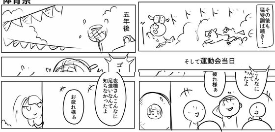 第2話は初期案から完成度がかなり高く、細かい設定やネタの微調整のみの変更でした。例えば以下の画像では、左側の初期案と右側の最終版では「コマの外が黒いかどうか」と「2コマ目のひかるの服装」が異なっています。これは、初期案では回想シーンで特訓が行われた成果として足が速くなったという設定だったため、回想を示す効果として黒背景になり、ひかるが幼少期の格好をしているというわけ。回想により時間軸が行ったり来たりするのは読みにくい一因になりがちのため、回想を現代に変更しました。