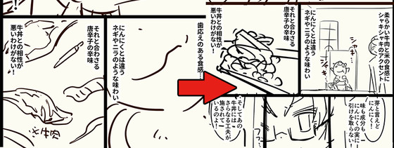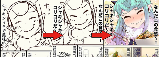 さらに、食レポのファーストリアクションだけではなく、続くリアクションにも注目。画像左の初期案では、より細かい食レポを入れるために「もぐもぐする口元」「牛丼のうまみのイメージ絵」を入れていますが、右の変更後では「堪能する様子を引きの絵で」「箸で今まさに食べる直前」を描いています。これは、より「おいしそう、食べたい」と思ってもらえた方が読んでいて面白くなるため、ミントのリアクションに同調してもらえるように、解説よりもミントの実体験を伝えるようなイメージ。