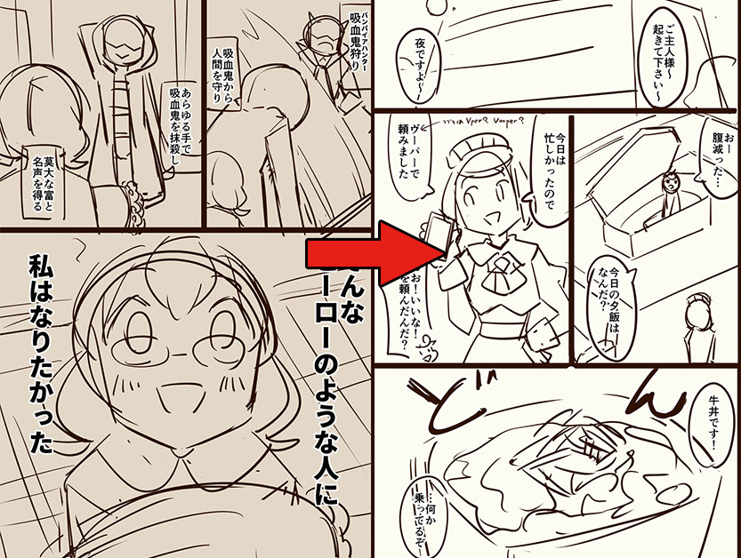 また、「ご主人様にんにく臭いです!」は吸血鬼×グルメなマンガ作品なので、「食レポ」部分が大事なポイント。そのため、まず最初のリアクションを大事にするため、アッサリした感想だった初期案からよりおいしそうな反応に変更。また、作画時には特に気合を入れておいしさの感動が伝わるように工夫されています。