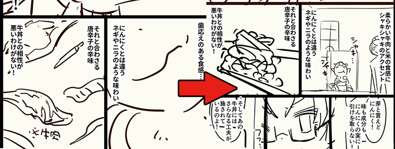さらに、食レポのファーストリアクションだけではなく、続くリアクションにも注目。画像左の初期案では、より細かい食レポを入れるために「もぐもぐする口元」「牛丼のうまみのイメージ絵」を入れていますが、右の変更後では「堪能する様子を引きの絵で」「箸で今まさに食べる直前」を描いています。これは、より「おいしそう、食べたい」と思ってもらえた方が読んでいて面白くなるため、ミントのリアクションに同調してもらえるように、解説よりもミントの実体験を伝えるようなイメージ。