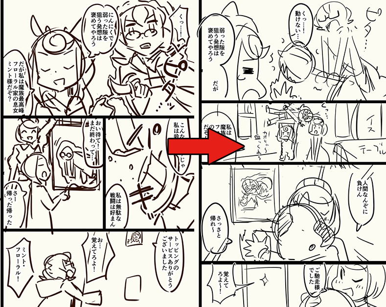 もう一つ大事なのが最後のページ。変更前と変更後でセリフ自体はほとんど同じですが、キャラクターの動きの描写が大きく変わっています。これは、「敵が現れたので撃退した」というオチをより動きだけで分かりやすくするために派手にしたという意図。最後は大事なので丁寧に考える必要がありますが、次のページとのつながりを考える必要はないため大胆に面白さを意識することが可能です。