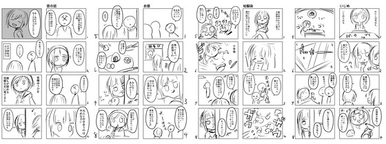 「とにかくイジメたい朝日奈さん」の初期ネームは以下の画像のような感じ。4コマが8行でひとまとめになったストーリー構想で、それぞれネタのアイデアが連載時の1話から5話のエピソードになっています。