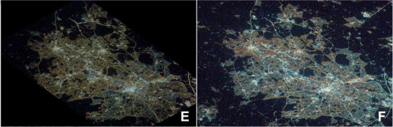 イギリス・バーミンガム(Eが2013年でFが2020年)は新しい画像だと全体的に色合いが白っぽくなっており、急速にLED照明が普及しているのがわかります。研究チームは、イギリス・イタリア・アイルランドなどではLED照明への大きな転換がみられた一方、オーストリア・ドイツ・ベルギーなどでは変化が小さかったと報告しました。