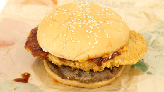 食べてみると、サクッとした食感の分厚いチキンパティが口の中ではじけ、バーガーキングおなじみの炭火焼きビーフパティとともに肉のうまみを存分に堪能することができます。バーガーの中央まで食べ進めると、これまたサクッとしたガーリックフレークがヒリヒリとした強烈な辛さをもたらしてくるように。BBQソースがビーフパティにもチキンパティにもよく合うバーガーで、サクサク食感・肉・辛さを味わいたい人にオススメです。