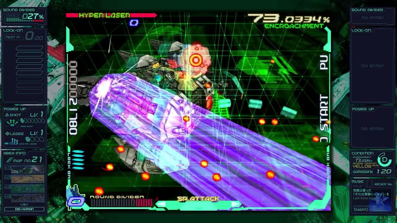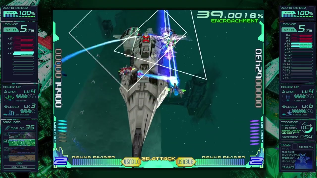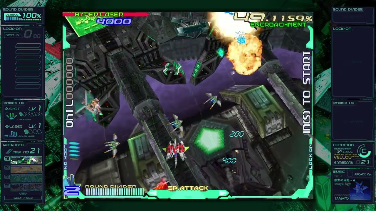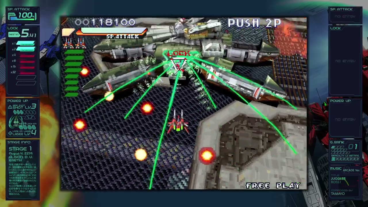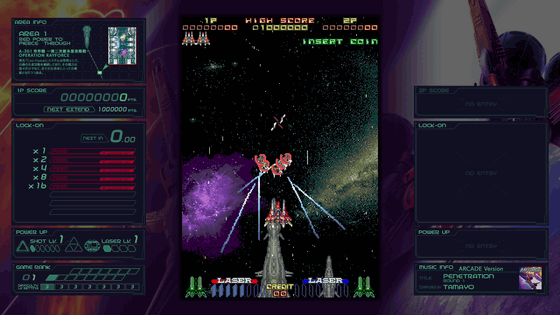 さらに、縦画面の「レイフォース」をアスペクト比16:9の横画面でプレイするため、左右の余ったスペースには「ガジェット」と呼ばれる情報ウィンドウが配置されており、得点やロックオン数、自機の強さ、ゲーム難度、BGMなどが表示されます。プレイ中にじっくり見る余裕はあまりないのですが、ゲーム中ではほとんど語られないストーリーや世界観に関する情報も表示されているので、目を通しておくとゲームへの理解度が上がります。