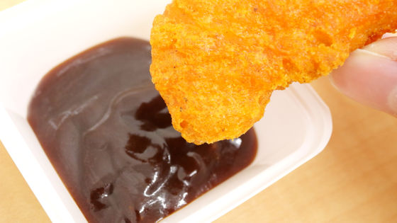 そんなわけでBBQソースを付けて食べてみます。ソース自体は非常にコクが深く、スモーキーな味わい。甘みと塩気の両方が引き立ち、ナゲットにもよく合います。