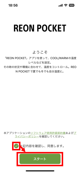 以下の画面が表示されたらソフトウェア使用許諾契約書とプライバシーポリシーをよく読み、同意のチェックを入れてから「スタート」をタップ。