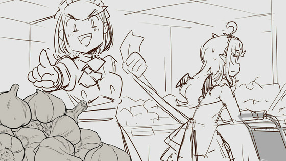 作者のゆめきさんが描き下ろしたトップ画用のラフが以下。「ご主人様にんにく臭いです!」のストーリーは、にんにくとにんにく料理が大好きなメイドのカオリ(以下の画像左)が、にんにくを弱点とする吸血鬼のミント(画像右)に、おいしそうな料理で誘惑してにんにくを食べさせる、という流れが主になっています。そこで、ラフ案では「一緒に買い物に行き、にんにくを発見したカオリが、ご主人様であるミントを引っぱる」という2人の関係性が伝わる1枚が描かれました。