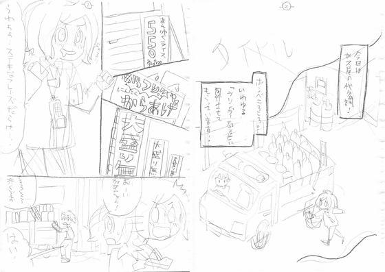 ネームの初稿では、第3話の導入は以下の画像のようになっていました。1ページ目は画像左の「おいしそうな看板にテンションを上げるキユ」、2ページ目はタイトルが表示される扉でありつつ「シリンダー配送の仕事をする」と示す内容です。「ガス屋さん」は料理とも強く結び付いているため、仕事中においしそうなフレーズや匂いにつられてしまうことは「あるある」かもしれませんが、ここでは「第2話で仕事の失敗を経験し、少しヘコんでいるキユが、第3話の仕事の中で復活していく」というエピソードの導入としてふさわしくなかったため、大きく変更。