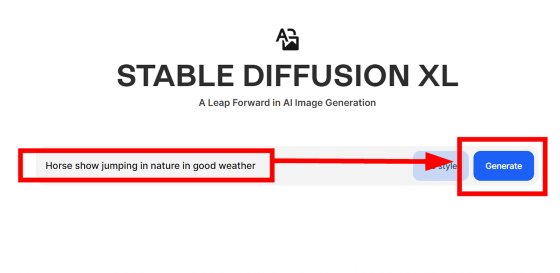 ClipDropの公式サイトにアクセスしたら、中央の入力欄にプロンプトを入力します。今回は「Horse show jumping in nature in good weather(天気の良い日に自然の中で行われている馬が飛ぶショー)」というプロンプトを入力し、「Generate」をクリック。