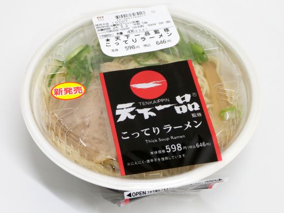 スープの再現度は高めですが麺は本家と比べて柔らかめで、本家が「麺と麺の間にスープが絡んで口に入ってくる」という感覚なのに対して「天下一品監修 こってりラーメン」は「麺がスープを吸って口に入ってくる」という感じ。このため、スープを飲んでいる間は「本家に近い味だな~」と感じられるのですが、麺をすすると本家との差が開きます。それでも「ドロッとした濃厚なスープを麺と一緒に食べる」という天下一品っぽい体験は可能なので、24時間入手可能なラーメンとしてはかなりアリです。