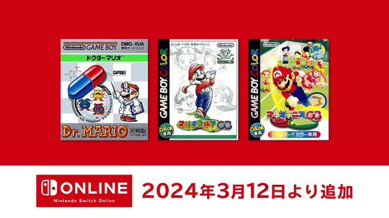 Nintendo Switch Onlineに2024年3月12日から「ドクターマリオ」「マリオゴルフGB」「マリオテニスGB」が追加されることも合わせて発表されました。