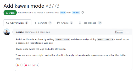 ニューマン氏はさわらつき氏のロゴを発見した直後に、Blueskyの開発リポジトリで「BlueskyウェブアプリのURL末尾に『?kawaii=true』というパラメータを追加すると『Kawaiiモード』に切り替わり、さわらつき氏のロゴを表示する」という機能を提案。記事作成時点ではmainブランチにマージされているため、近い内に正式リリースされると思われます。