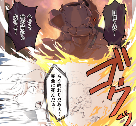 変更後のネームが以下。それぞれのキャラクターがより大きく描かれています。また、最期のコマでクズールがバックドロップを食らっていますが、初期ネームとは前後逆にすることで、クズールのリアクションがこちらに見えるようにしているのもささやかながら重要なポイント。