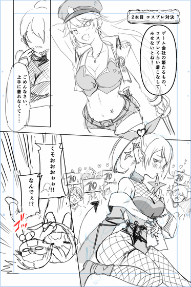 このコスプレ対決のシーンには、衣装の別案もありました。以下がもう片方の案で、ゲーム会社で開催されるコスプレ対決ということで、実在する人気ゲームのキャラクターの衣装を参考にした衣装になっていました。