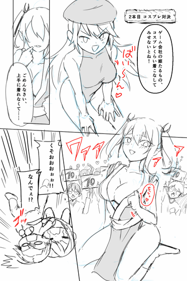 また、第4話のメイキングで注目したいのは「コスプレ対決」のシーン。以下が初期ネームで、2人がそれぞれコスプレ姿を披露しています。キャラが特別な衣装で魅力的に描かれるシーンですが、キャラが前面に現れていないのはもったいないため、構図を変更。