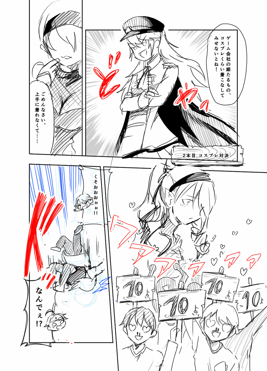 なお、さらなる余談として、4話の作成時には「秘密の宮園」の原作ネーム担当であるすこやかさんにネームをチェックしてもらいアドバイスをいただきました。その際に、「コスプレシーンみていたら描きたくなっちゃった」として送られてきた以下の画像が、初期ネームの第2案の参考になっていたという事情があります。