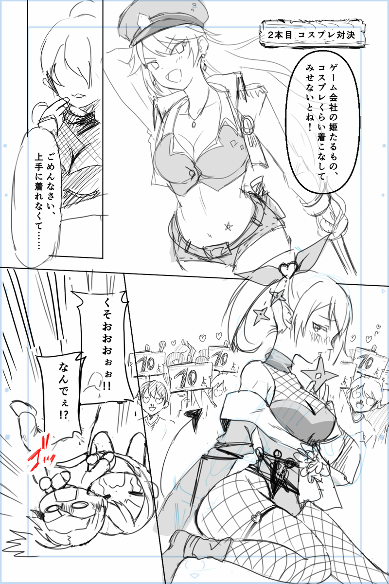 また、第4話のメイキングで注目したいのは「コスプレ対決」のシーン。以下が初期ネームで、2人がそれぞれコスプレ姿を披露しています。キャラが特別な衣装で魅力的に描かれるシーンですが、キャラが前面に現れていないのはもったいないため、構図を変更。
