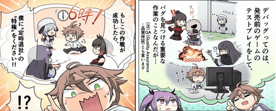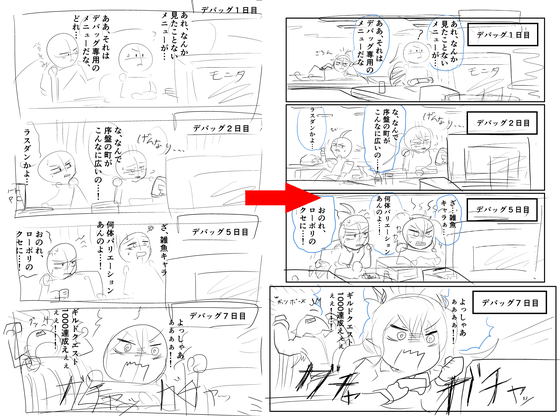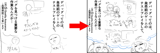 同様に以下のシーンでも、画像左の初期ラフでは、「デバッグ」について話す背景にデバッグ作業をしているカットを入れていました。画像右の修正ネームでは、デバッグ作業のイメージ絵として「クズールの仲間たちをゲームキャラに見立て、バグに戸惑う様子」という絵を入れることで、見た目に面白いコマになるよう工夫しています。