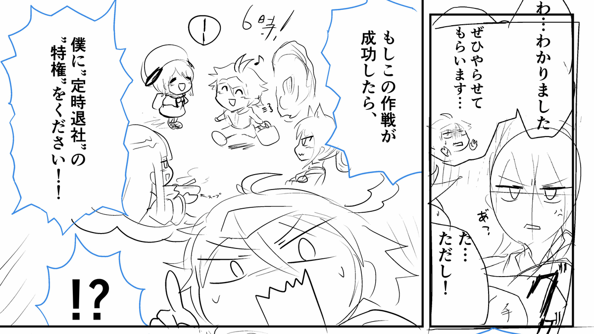 それぞれの完成版は以下のような感じ。楽しい絵面のコマにしたいのもありますが、裏話として、「会社がメインのエピソードだと、異世界のキャラクターたちが登場できないので、イメージ絵などで入れたい」という意図もあります。