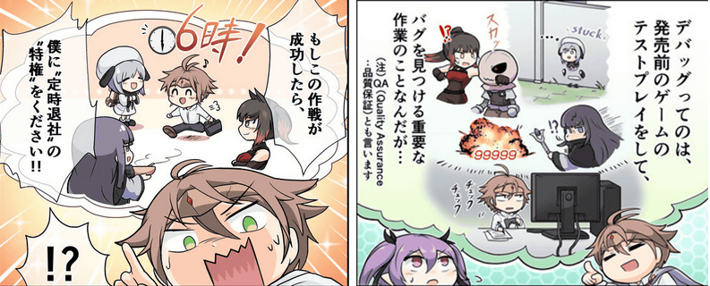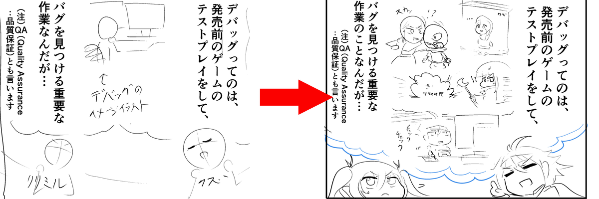 同様に以下のシーンでも、画像左の初期ラフでは、「デバッグ」について話す背景にデバッグ作業をしているカットを入れていました。画像右の修正ネームでは、デバッグ作業のイメージ絵として「クズールの仲間たちをゲームキャラに見立て、バグに戸惑う様子」という絵を入れることで、見た目に面白いコマになるよう工夫しています。